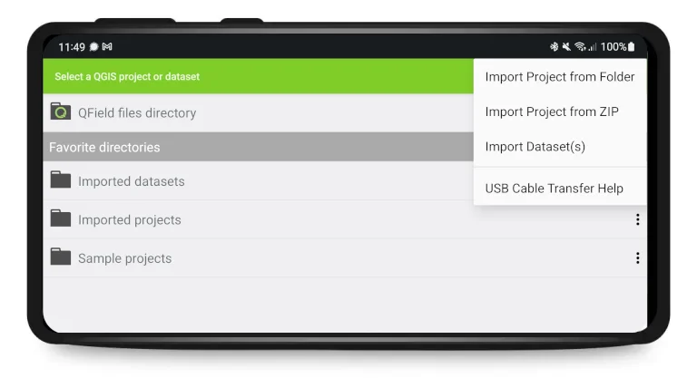 Practically, this means that instead of being shown and having access to the full storage tree when clicking on the “Open local files” button, users are now shown a set of new folders named ‘QField files directory’, ‘Imported datasets’, and ‘Imported projects’ as well as a drop-down menu accessible via a top-right three-dot button.