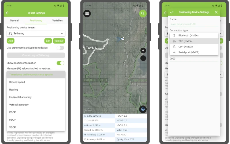 These new receivers unlock NTRIP-driven centimetre accuracy for devices that use the Bluetooth connection to a manufacturer’s application to connect to NTRIP servers. In this scenario, QField could not initiate a Bluetooth connection since it was already taken. With the new TCP and UDP receivers - provided the manufacturer’s application offers NMEA streaming over either of those Internet protocols - QField can connect and consume high-accuracy positioning.