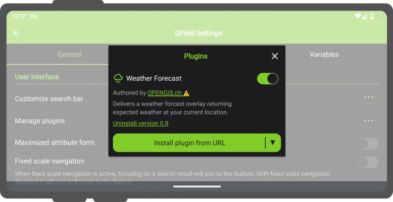 In QField, open the plugins manager popup found in the settings panel, and use the ‘Install plugin from URL’ button to paste a URL pointing to a zipped plugin file.