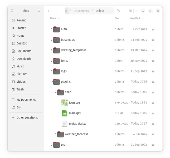 As seen in the screenshot above, which demonstrates the directory hierarchy, a given plugin directory must contain at least two files: a main.qml file, which QField will use to activate the plugin, and a metadata.txt file containing basic information on the plugin, such as the plugin name, author details, and version.