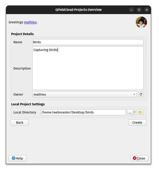 In the subsequent panel dialog, choose the ‘Create a new empty QFieldCloud project’ and then hit the ‘Next’ button. Give it a name and a description, and for the local directory, pick the folder within which you had extracted the birdwatcher project, then hit the ‘Create’ button.
