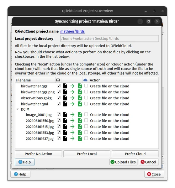 QFieldSync will then ask you to upload your newly created cloud project environment to the server. Notice how the project plugin file (birdwatcher.qml) is part of the files to be delivered to the cloud. Confirm by clicking on the ‘Upload to server’ button.