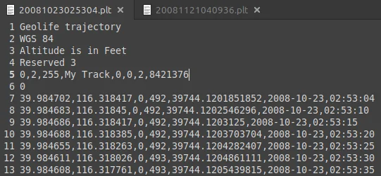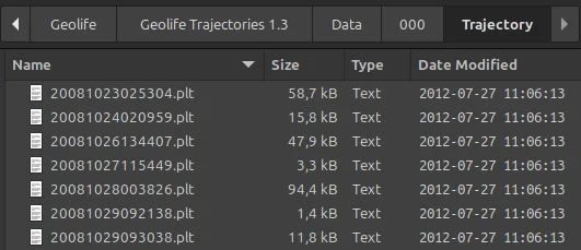 The GeoLife GPS Trajectories download contains 182 directories full of .plt files: