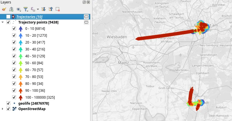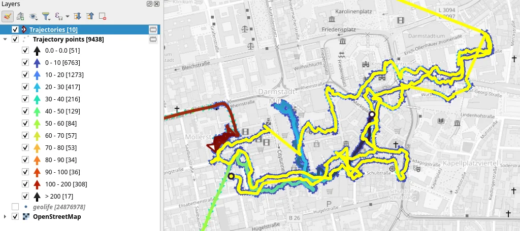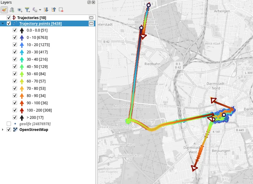 When we zoom in to Darmstadt and enable the trajectories layer, we can see each individual trip. Looks like car trips on the highway and walks through the city: