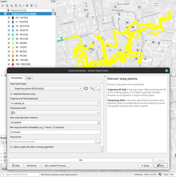 Selecting the 9,438 points in this extent, let’s compute movement metrics (speed & direction) and create trajectory lines: