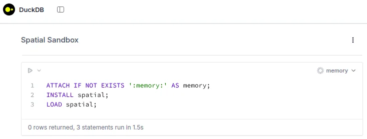 The spatial extension is a DuckDB core extension, so it’s readily available. We can create a spatial db with: