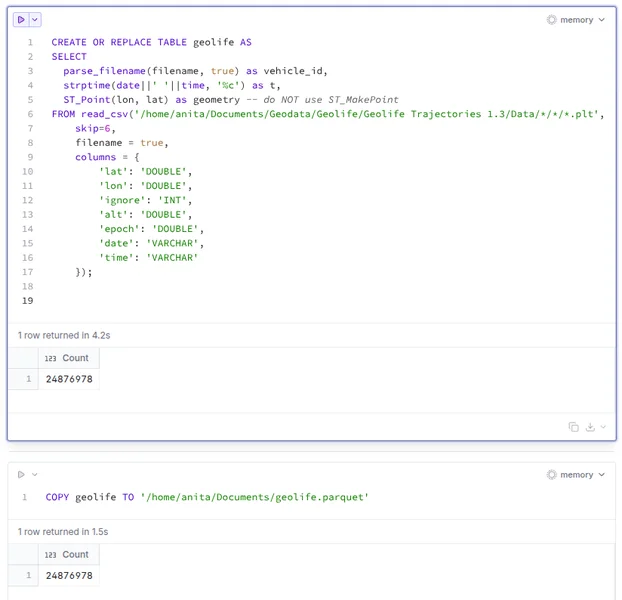 The last time I preprocessed the whole GeoLife dataset, I loaded it into PostGIS. Today, I want to share a new workflow that creates a (Geo)Parquet file and that is much faster.