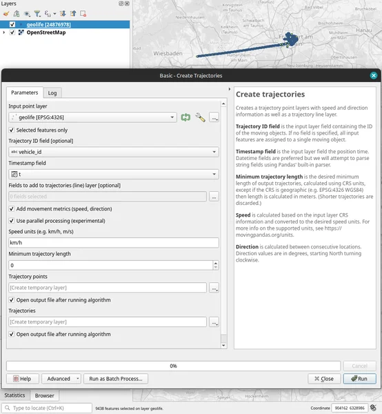 DuckDB has been great for this ETL workflow. I didn’t use much of its geospatial capabilities here but I was pleasantly surprised how smooth the GeoParquet creation process has been. Geometries are handled without any special magic and are recognized by QGIS. Same with the timestamps. All ready for more heavy spatiotemporal analysis with Trajectools.