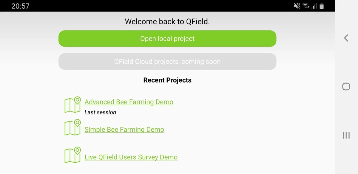 QField is all about efficiency. While favourites folders in the file selector already give a great productivity boost, very often we work with the same 3-4 projects. This is why we redesigned the welcome screen to list the last five project used. And if you look carefully you might get a hint of what will be coming soon…